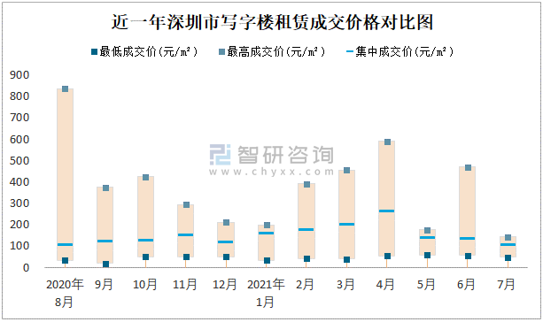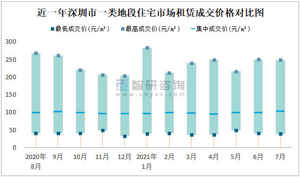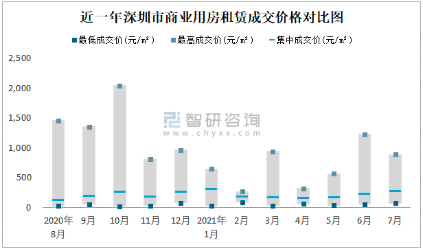 根據國信房地產信息網數據可知:近一年深圳市商業用房租賃集中成交價在114.72元/m²-293.77元/m²之間波動,7月集中成交價為261.91元/m²;寫字樓租賃集中成交價今年4月達到最高值(258.4元/m²)。
