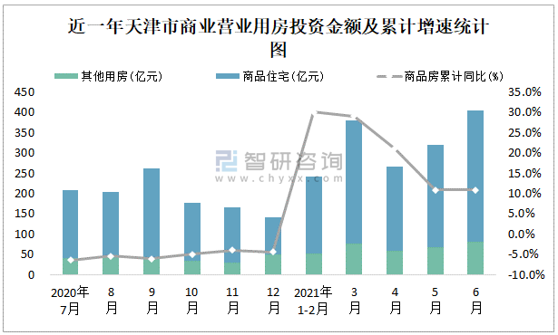 根據(jù)國家統(tǒng)計局?jǐn)?shù)據(jù)統(tǒng)計可知:2021年6月天津市房地產(chǎn)開發(fā)投資商品房投資金額為404.03億元,其中包括辦公樓、商業(yè)營業(yè)用房等其他用房80.68億元(注:辦公樓、商業(yè)營業(yè)用房未分開統(tǒng)計);2021年1-6月天津市房地產(chǎn)開發(fā)投資包括商業(yè)營業(yè)用房在內(nèi)的其他用房累計金額為334.15億元。