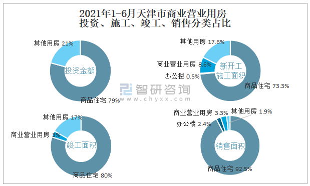 根據(jù)國家統(tǒng)計局?jǐn)?shù)據(jù)統(tǒng)計可知:2021年1-6月天津市房地產(chǎn)開發(fā)企業(yè)在包括商業(yè)營業(yè)用房在內(nèi)的其他用房投資金額占比為20.7%(注:只有投資金額中其他用房包含辦公樓、商業(yè)營業(yè)用房),商業(yè)營業(yè)用房的新開工面積與竣工面積所占比重差異不大,從銷售面積來看,商業(yè)營業(yè)用房銷售面積占比高于辦公樓銷售面積占比。