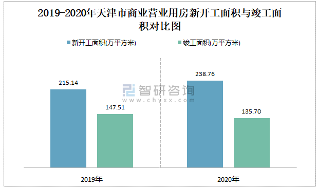 2019-2020年天津市商業(yè)營業(yè)用房新開工面積與竣工面積對比圖