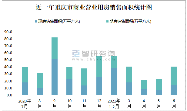 根據國家統計局數據可知:2021年6月重慶市商業營業用房銷售面積為40.31萬平方米(其中銷售現房13.89萬平方米,期房26.42萬平方米);2021年1-6月重慶市商業營業用房累計銷售面積為180.63萬平方米;近一年重慶市商業營業用房期房銷售面積遠高于現房銷售面積。