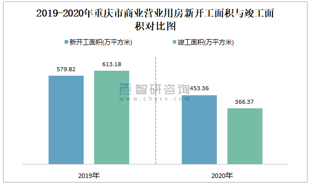 2019-2020年重慶市商業營業用房新開工面積與竣工面積對比圖