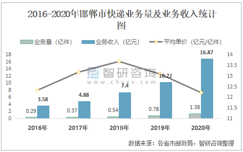2016-2020年邯鄲市快遞業(yè)務(wù)量及業(yè)務(wù)收入統(tǒng)計(jì)圖