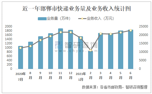 近一年邯鄲市快遞業(yè)務(wù)量及業(yè)務(wù)收入統(tǒng)計(jì)圖