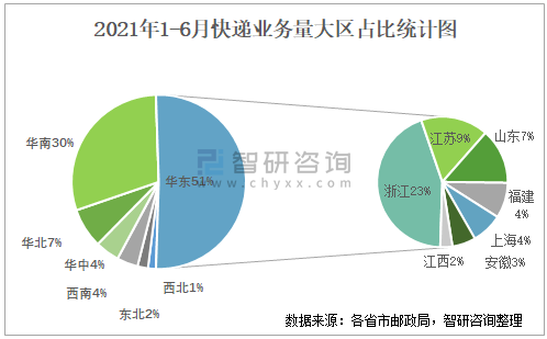 2021年1-6月快遞業務量大區占比統計圖