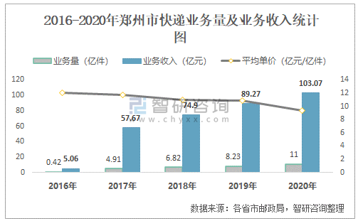 2016-2020年鄭州市快遞業務量及業務收入統計圖
