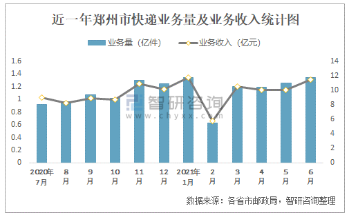 近一年鄭州市快遞業務量及業務收入統計圖