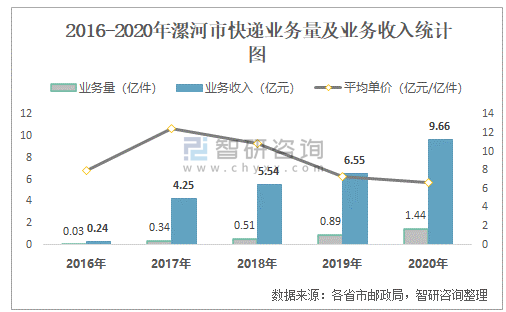 根據各省市郵政局數據可知:2021年6月漯河市快遞業務量為1776.36萬件,業務收入為11136.86萬元;2021年1-6月漯河市快遞累計業務量為9492.08萬件,同比增長62.53%,累計業務收入為60198.23萬元,同比增長55.78%;2016-2020年漯河市快遞業務量與業務收入均逐年遞增,平均單價2017年達到最大值,此后呈現下降趨勢。