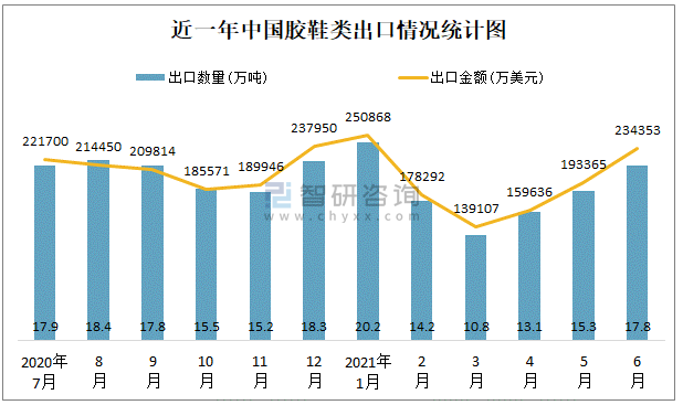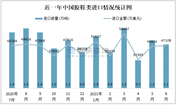 根據(jù)中國(guó)石油和化學(xué)工業(yè)聯(lián)合會(huì)數(shù)據(jù)顯示:2021年6月中國(guó)膠鞋類(lèi)進(jìn)口數(shù)量為1.1萬(wàn)噸,進(jìn)口金額為47108萬(wàn)美元;2021年6月膠鞋類(lèi)出口數(shù)量為17.8萬(wàn)噸,出口金額為234353萬(wàn)美元;近一年中國(guó)膠鞋類(lèi)出口總金額大于進(jìn)口總金額,貿(mào)易順差為主,6月出口均價(jià)13165.9美元/噸。