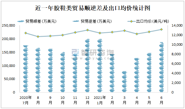近一年膠鞋類(lèi)貿(mào)易順逆差及出口均價(jià)統(tǒng)計(jì)圖