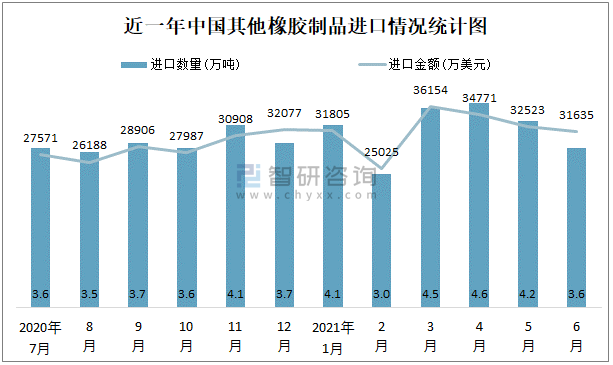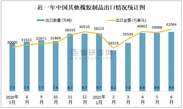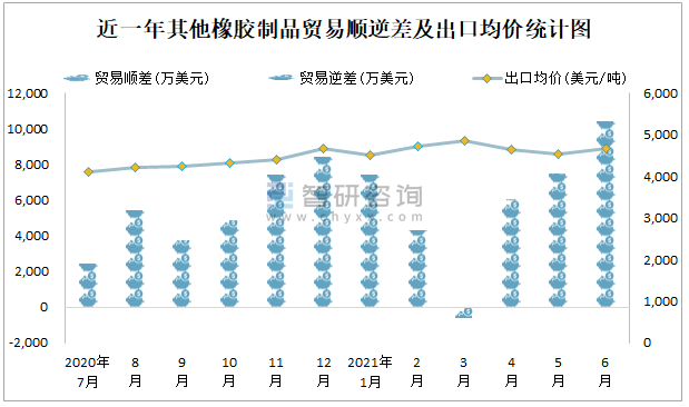 根據中國石油和化學工業聯合會數據顯示:2021年6月中國其他橡膠制品進口數量為3.6萬噸,進口金額為31635萬美元;2021年6月其他橡膠制品出口數量為9萬噸,出口金額為42064萬美元;近一年中國其他橡膠制品出口總金額大于進口總金額,貿易順差為主,6月出口均價4673.8美元/噸。