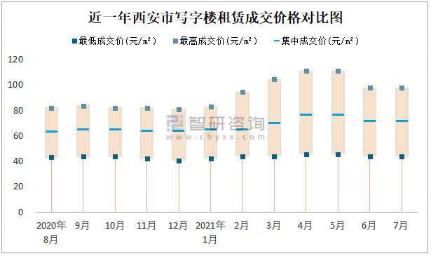 根據國信房地產信息網數據可知:近一年西安市商業(yè)用房租賃集中成交價在166元/m²-190元/m²之間波動,7月集中成交價為190元/m²;寫字樓租賃集中成交價今年4月達到最高值(76元/m²)。