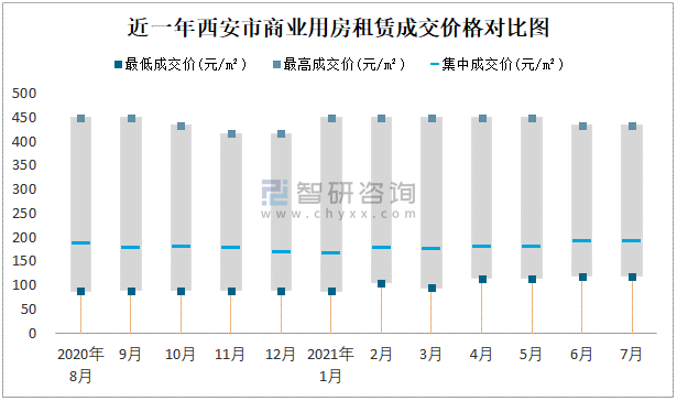 2021年7月西安市房屋租賃市場價格走勢:商業(yè)用房租賃價格在118.33元/㎡-433.33元/㎡之間,集中成交價約為190元/㎡