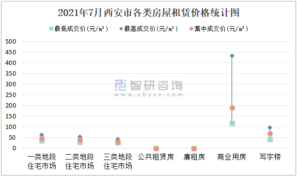 根據國信房地產信息網數據可知:2021年7月西安市7類房屋中,公共租賃房、廉租房無統計數據;商業(yè)用房租賃最低成交價、最高成交價、集中成交價均高于其他類房屋價格;三類地段住宅市場租賃集中成交價約為32元/m²,寫字樓租賃集中成交價高于所有類型地段住宅市場集中成交價。
