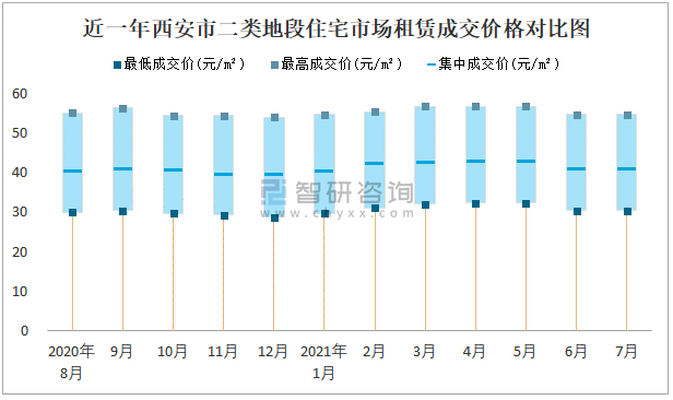 根據國信房地產信息網數據可知:近一年西安市一類地段住宅市場租賃成交價格有一定幅度波動,7月最高成交價與最低成交價差距為26.7元/m²;近一年西安市二類地段住宅市場租賃最低成交價與最高成交價的差距在24.33元/m²-26元/m²之間波動,2020年9月差距達到最大;近一年三類地段住宅市場租賃成交價格在26.33元/m²-45.33元/m²之間波動,7月集中成交價為32元/m²。