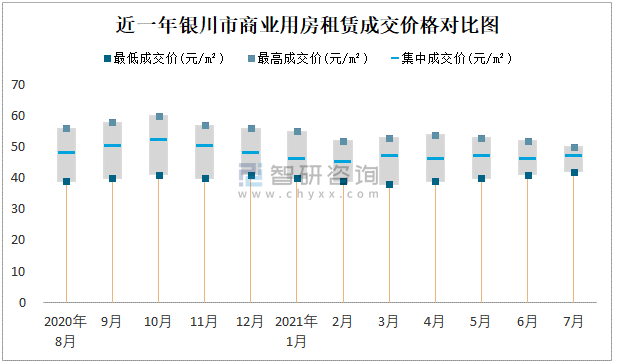 根據國信房地產信息網數據可知:近一年銀川市商業用房租賃集中成交價在45元/m²-52元/m²之間波動,7月集中成交價為47元/m²;寫字樓租賃集中成交價今年7月達到最高值(40元/m²)。