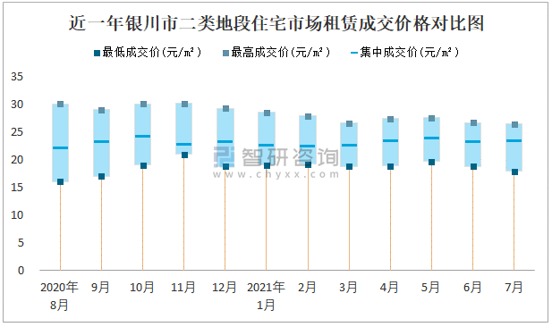 根據國信房地產信息網數據可知:近一年銀川市一類地段住宅市場租賃成交價格有一定幅度波動,7月最高成交價與最低成交價差距為9.8元/m²;近一年銀川市二類地段住宅市場租賃最低成交價與最高成交價的差距在7.79元/m²-14元/m²之間波動,2020年8月差距達到最大;近一年三類地段住宅市場租賃成交價格在12元/m²-25元/m²之間波動,7月集中成交價為15.19元/m²。