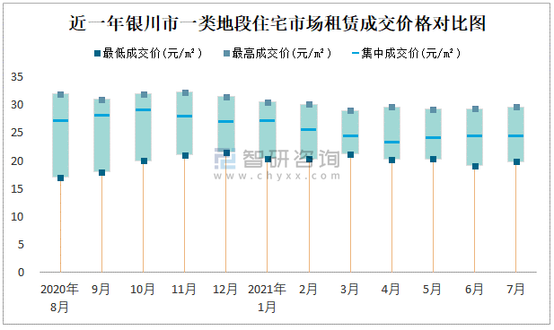 根據國信房地產信息網數據可知:2021年7月銀川市7類房屋中,公共租賃房租賃集中成交價為4.85元/m²,廉租房租賃集中成交價為1.1元/m²;商業用房租賃最低成交價、最高成交價、集中成交價均高于其他類房屋價格;三類地段住宅市場租賃集中成交價約為15.19元/m²,寫字樓租賃集中成交價高于所有類型地段住宅市場租賃集中成交價。