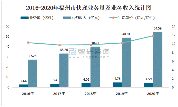 2016-2020年福州市快遞業務量及業務收入統計圖