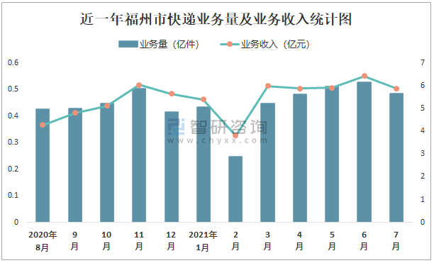 近一年福州市快遞業務量及業務收入統計圖