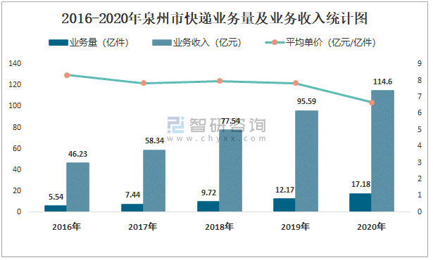2016-2020年泉州市快遞業(yè)務(wù)量及業(yè)務(wù)收入統(tǒng)計(jì)圖