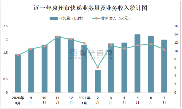 近一年泉州市快遞業(yè)務(wù)量及業(yè)務(wù)收入統(tǒng)計(jì)圖