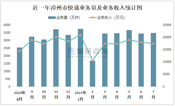 2021年7月漳州市快遞業務量與業務收入分別為3485.03萬件和17558.74萬元