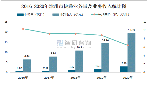 2016-2020年漳州市快遞業務量及業務收入統計圖