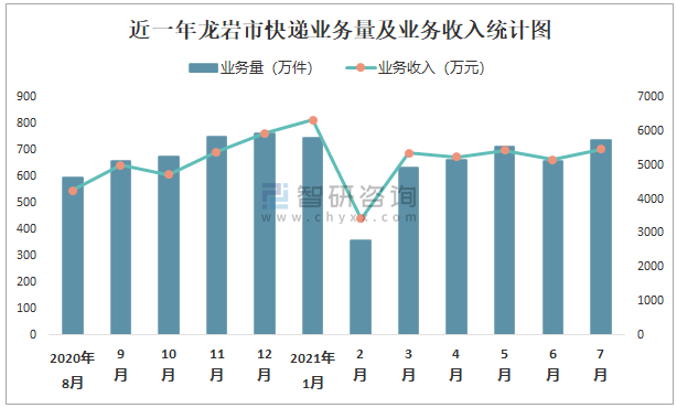 近一年龍巖市快遞業(yè)務(wù)量及業(yè)務(wù)收入統(tǒng)計(jì)圖