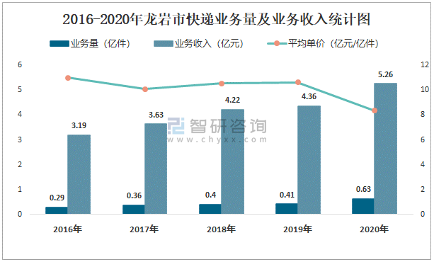2016-2020年龍巖市快遞業(yè)務(wù)量及業(yè)務(wù)收入統(tǒng)計(jì)圖