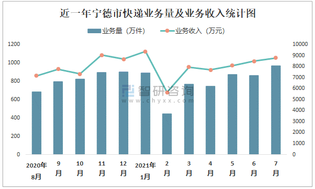 近一年寧德市快遞業務量及業務收入統計圖