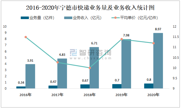 2016-2020年寧德市快遞業務量及業務收入統計圖