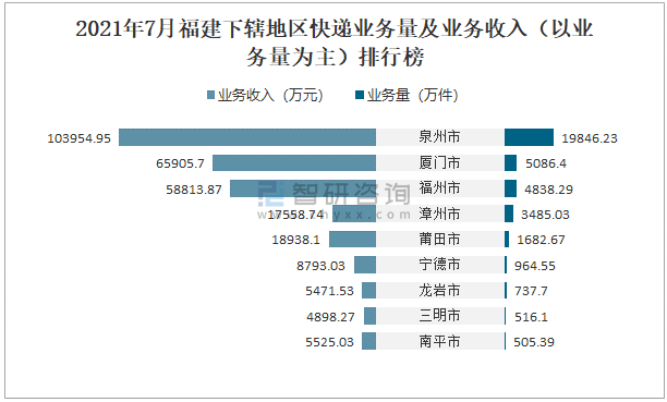 2021年7月福建下轄地區快遞業務量及業務收入(以業務量為主)排行榜