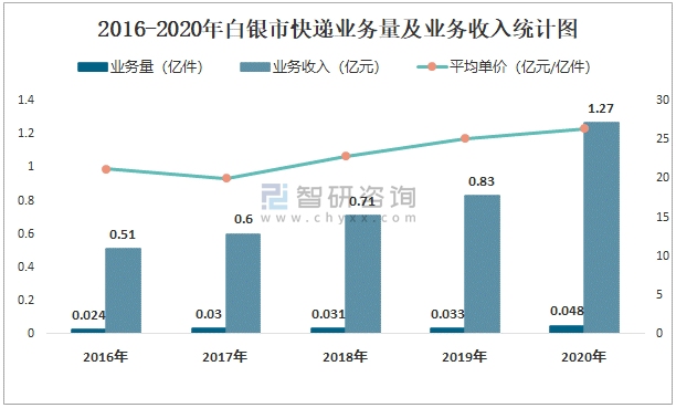2016-2020年白銀市快遞業(yè)務量及業(yè)務收入統(tǒng)計圖
