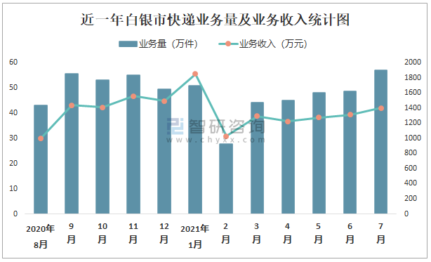 近一年白銀市快遞業(yè)務量及業(yè)務收入統(tǒng)計圖