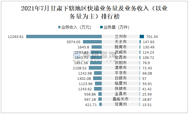 2021年7月甘肅下轄地區(qū)快遞業(yè)務量及業(yè)務收入(以業(yè)務量為主)排行榜