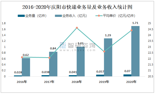根據(jù)各省市郵政局?jǐn)?shù)據(jù)可知:2021年7月慶陽市快遞業(yè)務(wù)量為76.9萬件,業(yè)務(wù)收入為1891.38萬元;2021年1-7月慶陽市快遞累計(jì)業(yè)務(wù)量為493.21萬件,同比增長(zhǎng)59.54%,累計(jì)業(yè)務(wù)收入為12896.16萬元,同比增長(zhǎng)69.24%;2016-2020年慶陽市快遞業(yè)務(wù)量與業(yè)務(wù)收入均逐年遞增,平均單價(jià)2018年達(dá)到最大值,此后有所下降。