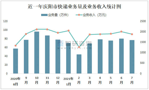 近一年慶陽市快遞業(yè)務(wù)量及業(yè)務(wù)收入統(tǒng)計(jì)圖