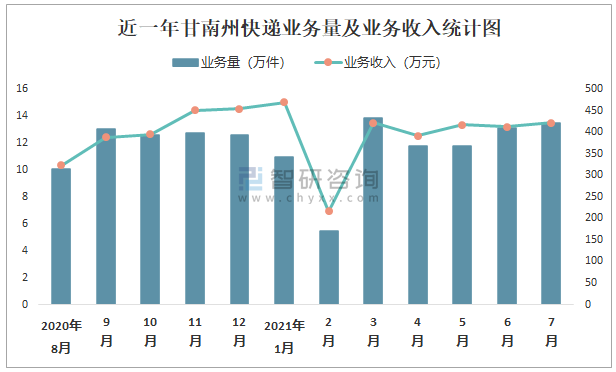 近一年甘南州快遞業(yè)務(wù)量及業(yè)務(wù)收入統(tǒng)計(jì)圖