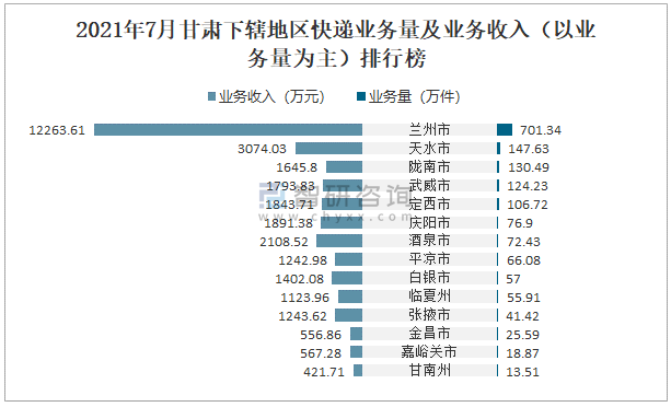 2021年7月甘肅下轄地區(qū)快遞業(yè)務(wù)量及業(yè)務(wù)收入(以業(yè)務(wù)量為主)排行榜