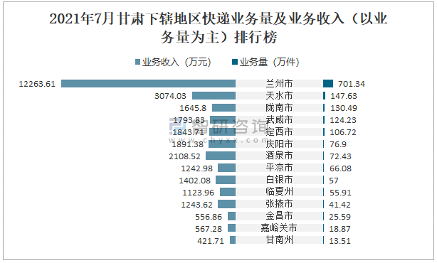 2021年7月甘肅下轄地區快遞業務量及業務收入(以業務量為主)排行榜