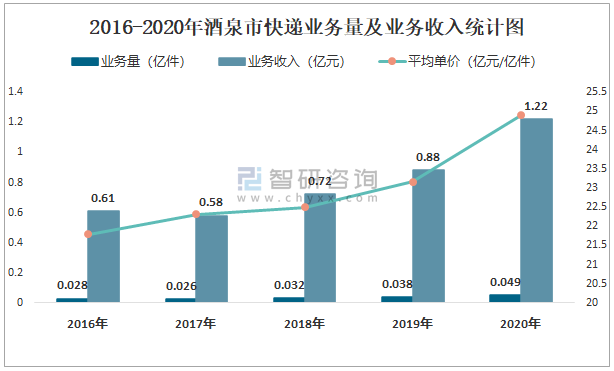 2016-2020年酒泉市快遞業務量及業務收入統計圖