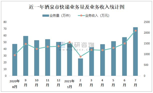 根據各省市郵政局數據可知:2021年7月酒泉市快遞業務量為72.43萬件,業務收入為2108.52萬元;2021年1-7月酒泉市快遞累計業務量為344.23萬件,同比增長50%,累計業務收入為9812萬元,同比增長71.36%;2016-2020年酒泉市快遞業務量與業務收入均總體呈現上升趨勢,平均單價逐年遞增。