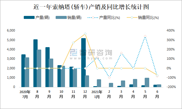 近一年索納塔(轎車(chē))產(chǎn)銷(xiāo)及同比增長(zhǎng)統(tǒng)計(jì)圖