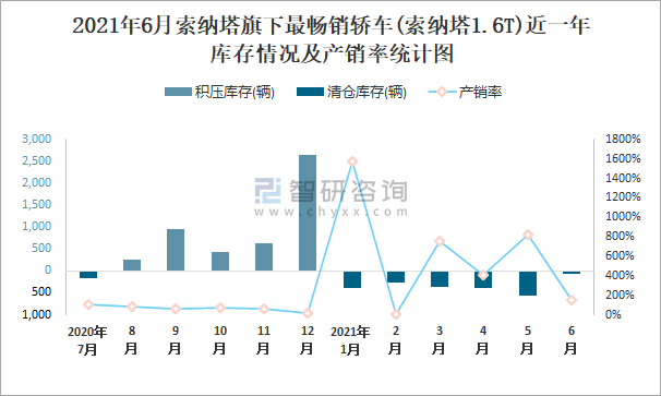 2021年6月索納塔旗下最暢銷(xiāo)車(chē)(索納塔1.6T)近一年庫(kù)存情況及產(chǎn)銷(xiāo)率統(tǒng)計(jì)圖