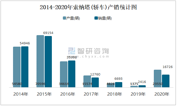 2014-2020年索納塔(轎車(chē))產(chǎn)銷(xiāo)統(tǒng)計(jì)圖