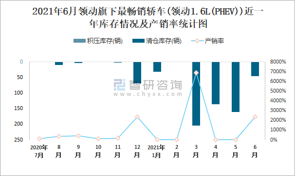 2021年6月領動旗下最暢銷車(領動1.6L(PHEV))近一年庫存情況及產銷率統計圖