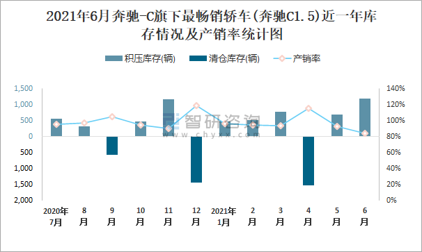 2021年6月奔馳-C旗下最暢銷車(奔馳C1.5)近一年庫存情況及產銷率統計圖