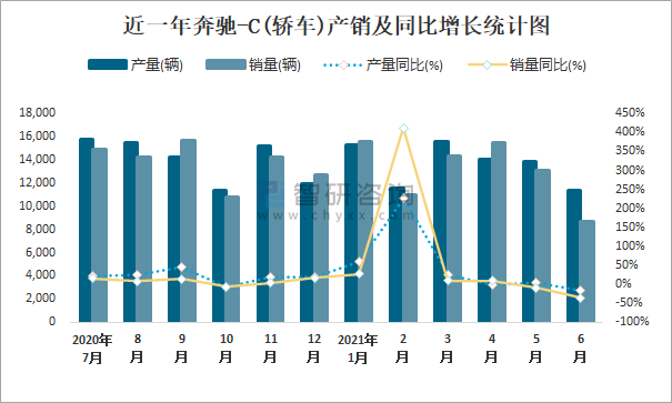 近一年奔馳-C(轎車)產銷及同比增長統計圖