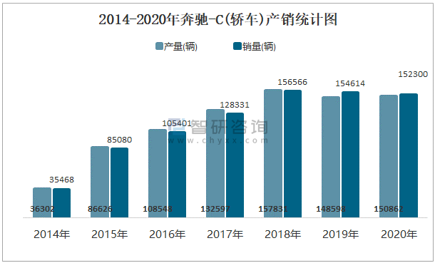 2014-2020年奔馳-C(轎車)產銷統計圖
